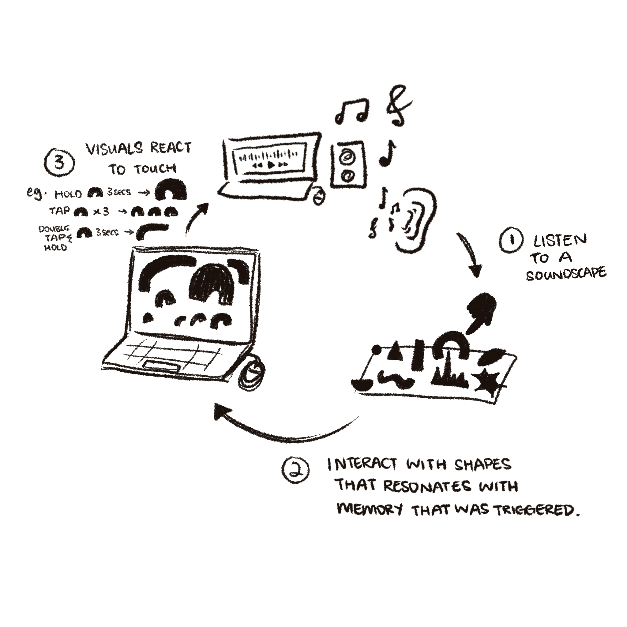 Firstly, listen to a soundscape. Next, based on whatever memories triggered, participants will mold shapes that they associate with sounds to reflect personal memories or emotions.