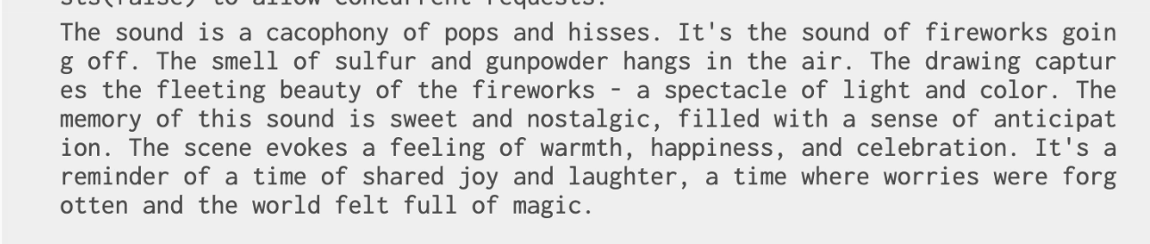 Through user-testings, it is said that a drawing interface retains a human touch (50% human 50% AI intelligence), making it an expressive experience. Every drawing is also unique, one of a kind and personal. The generated paragraphs based on drawings are fun to read, encouraging engagement. The generated sound frequency is a nice touch to an audio-visual experience. Sometimes the sentences can be so accurate, it hits close to home. Other times, a miss in accuracy can trigger a good laugh.