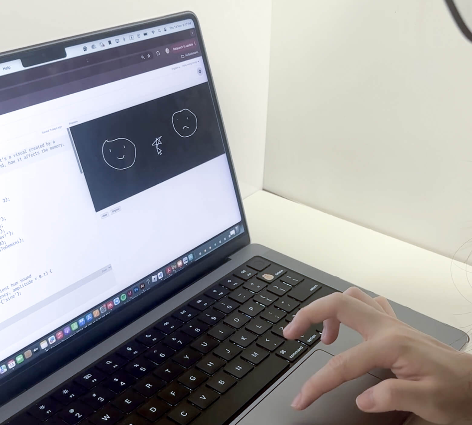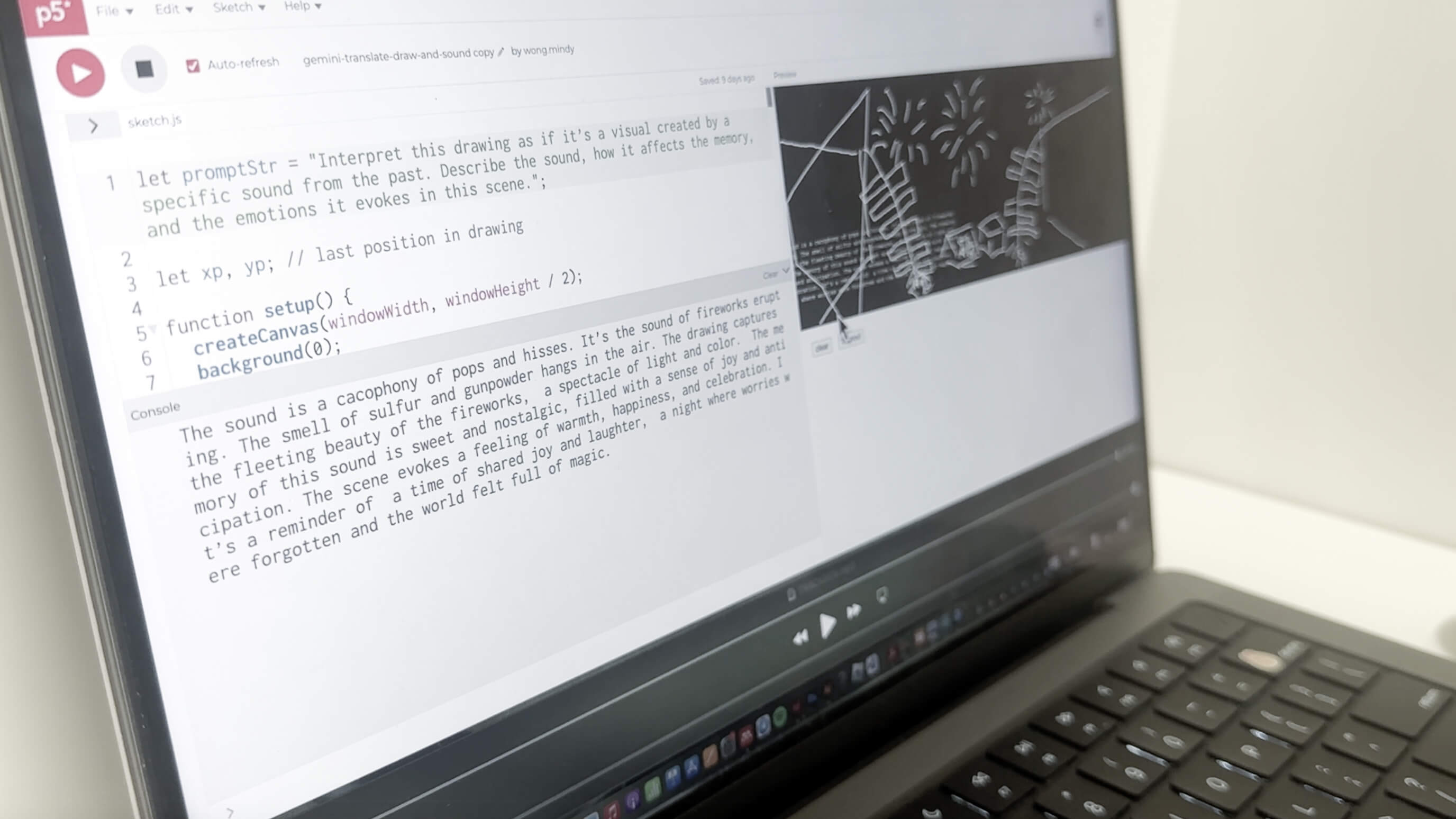 A drawing interface that allows users to interact by drawing out a recalled memory. Upon pressing the ‘improv!’ button, a frequency sound either low, mid or high could be heard and a paragraph of the memory-based drawing will be generated. This is done using Gemini API prompts in p5.js code.