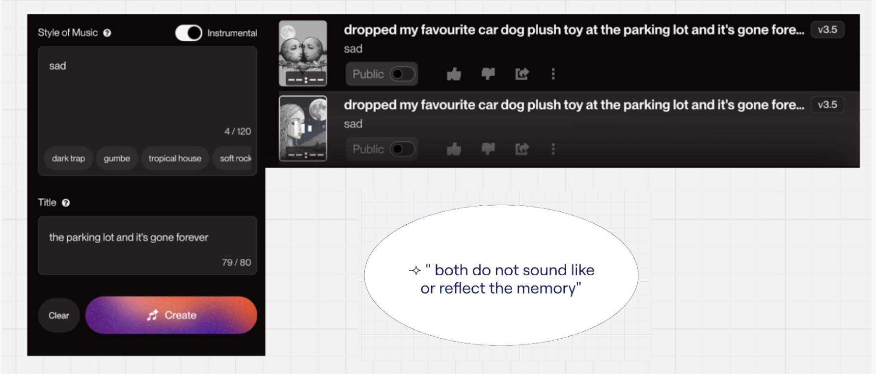 I know there are AI models that generate music based on texts and prompts given. Hence, this idea popped into my mind. What if I describe a specific memory to AI, will the music it generates based on my description sound like my memory? Each try, AI will generate 2 songs, one short version and another long version.