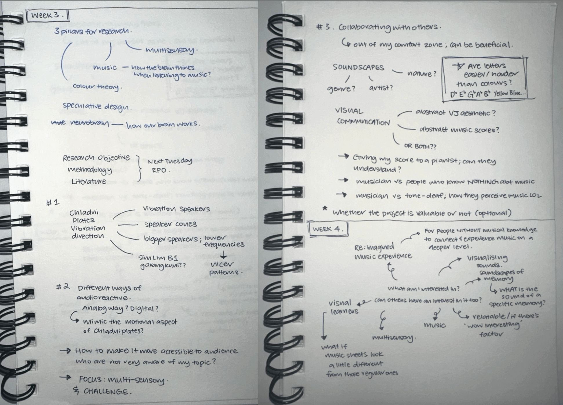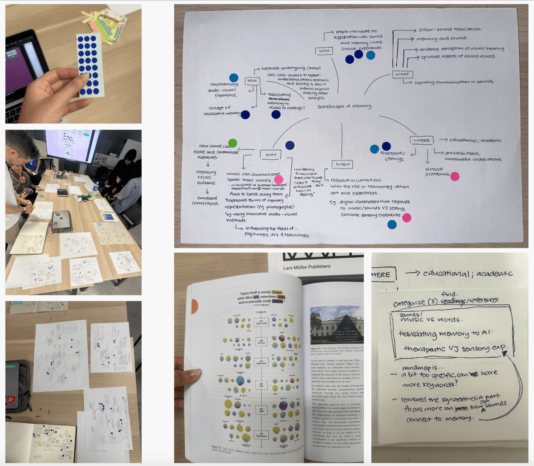 We went around reading each other’s concept map while allocating stickers on areas we were most interested in. From here, I can see that many of my classmates relate to the association with sound and memory and are interested in digital visualisations that respond to music or sounds in VJ or therapeutic settings.