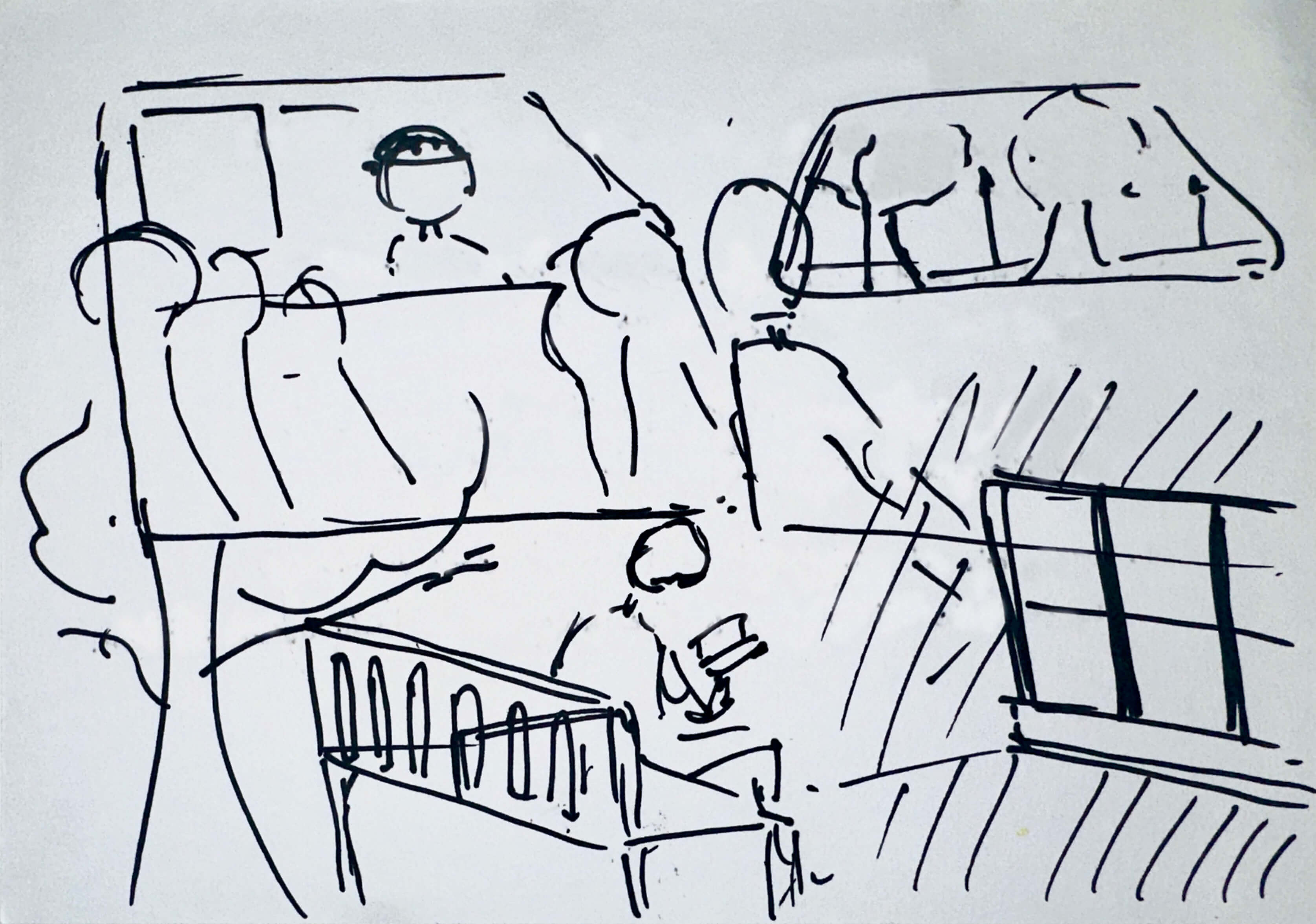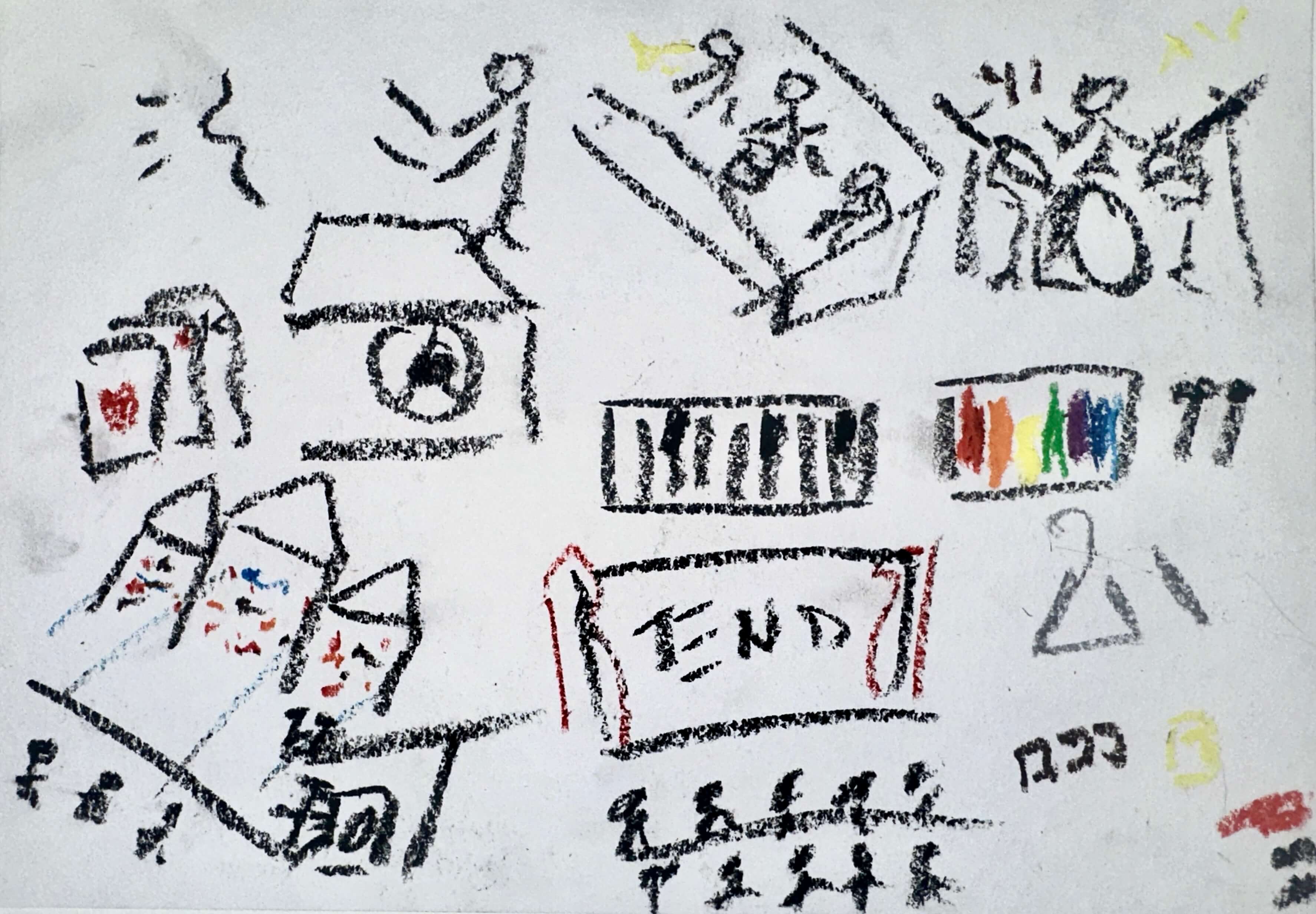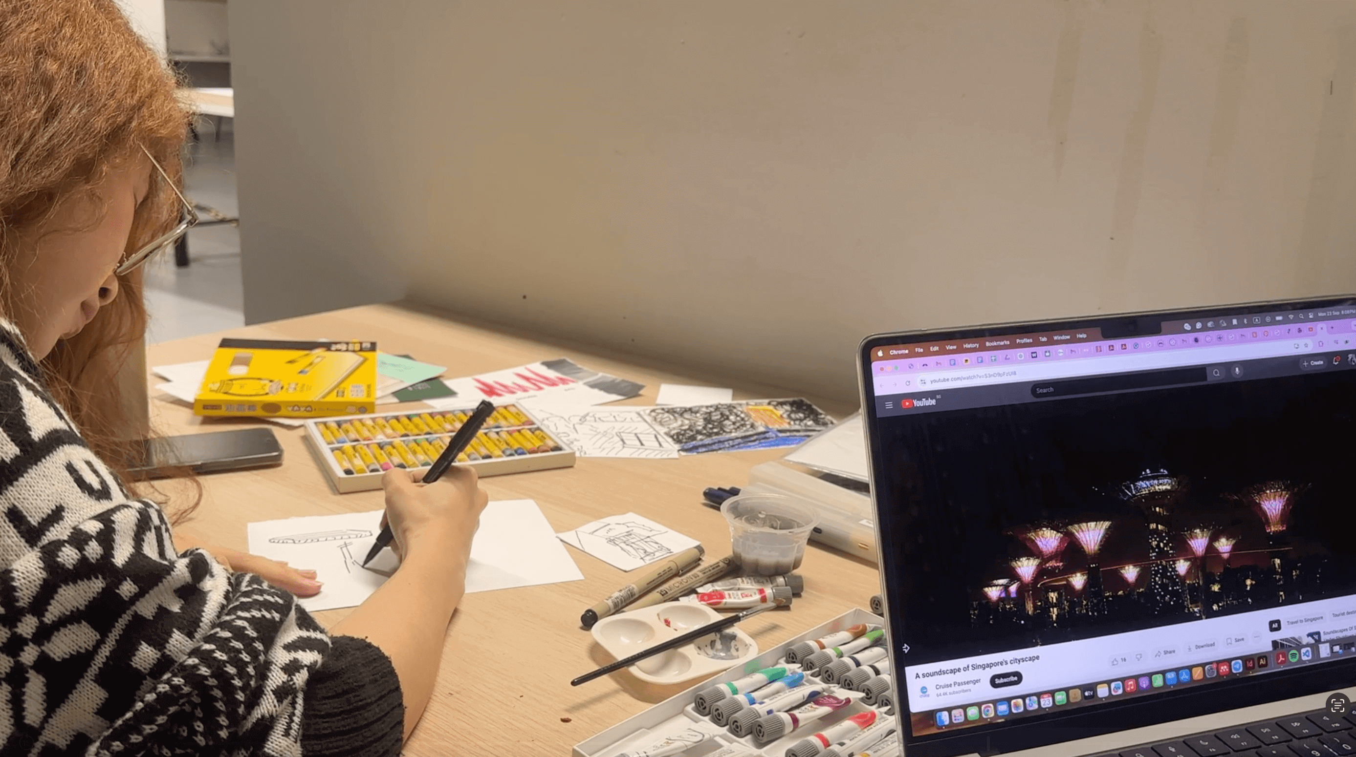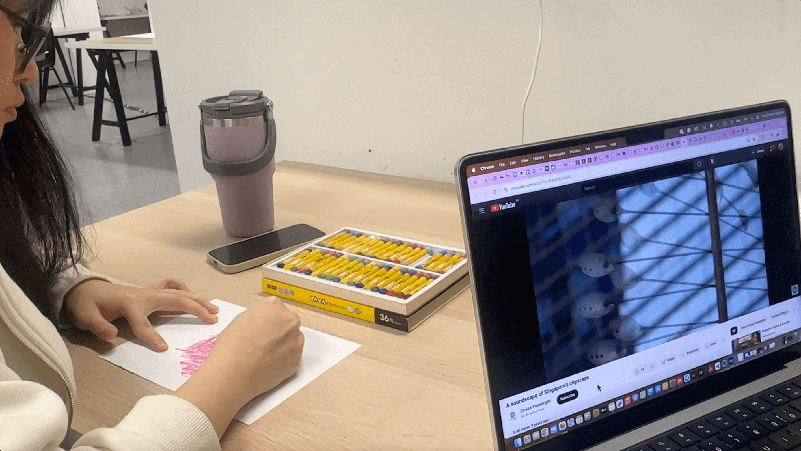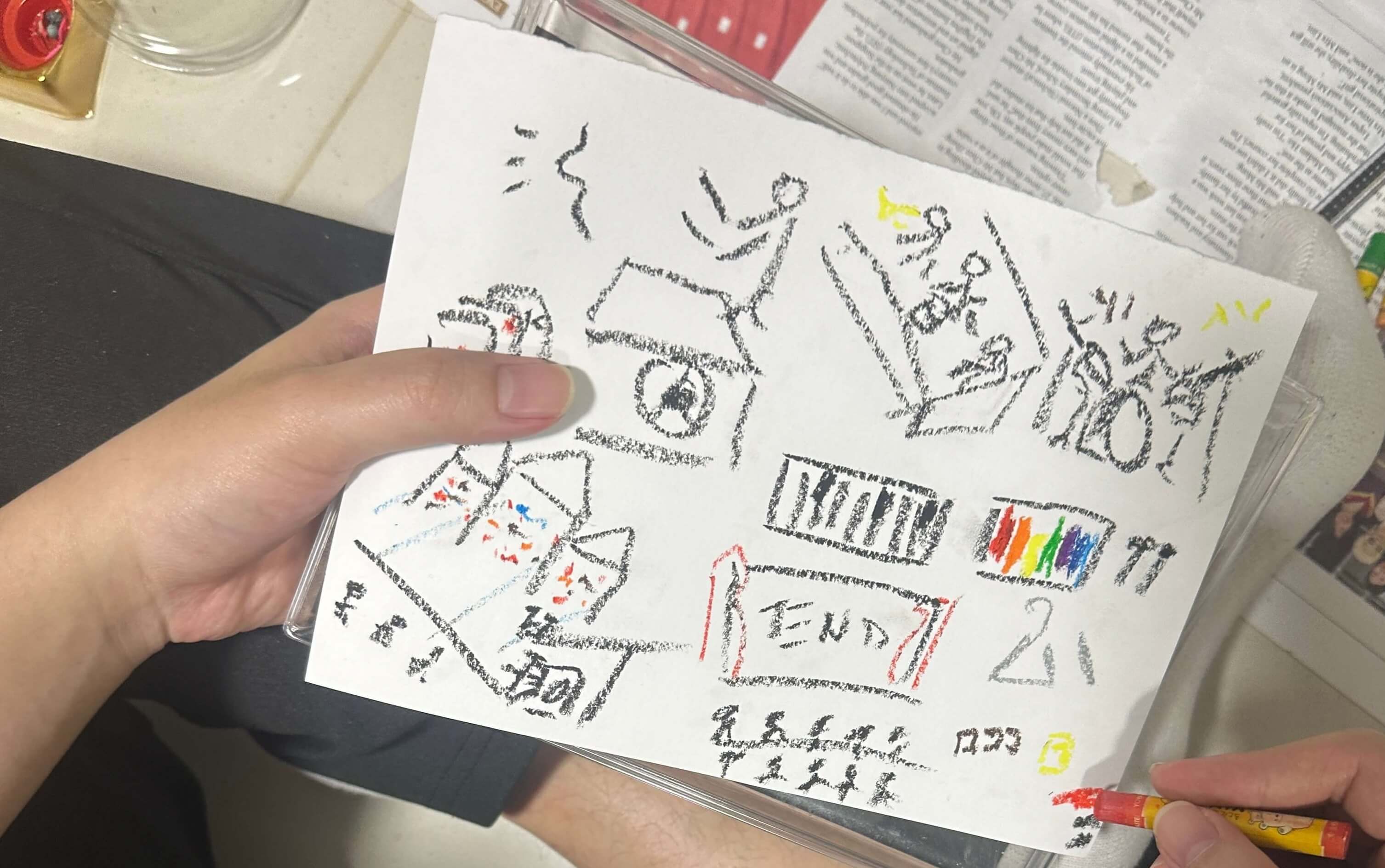 For example, Kaiying had to sketch her drawings out on a notepad before drawing it directly on the given paper. The rough sketch helped her memory to be more detailed. She also only uses black markers. Similarly, Ben tend to use more black crayons, whereas Zi Wei uses many coloured crayons.